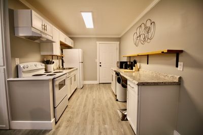 Fully equipped kitchen with silverware, glassware and all cookware needed when eating at home.